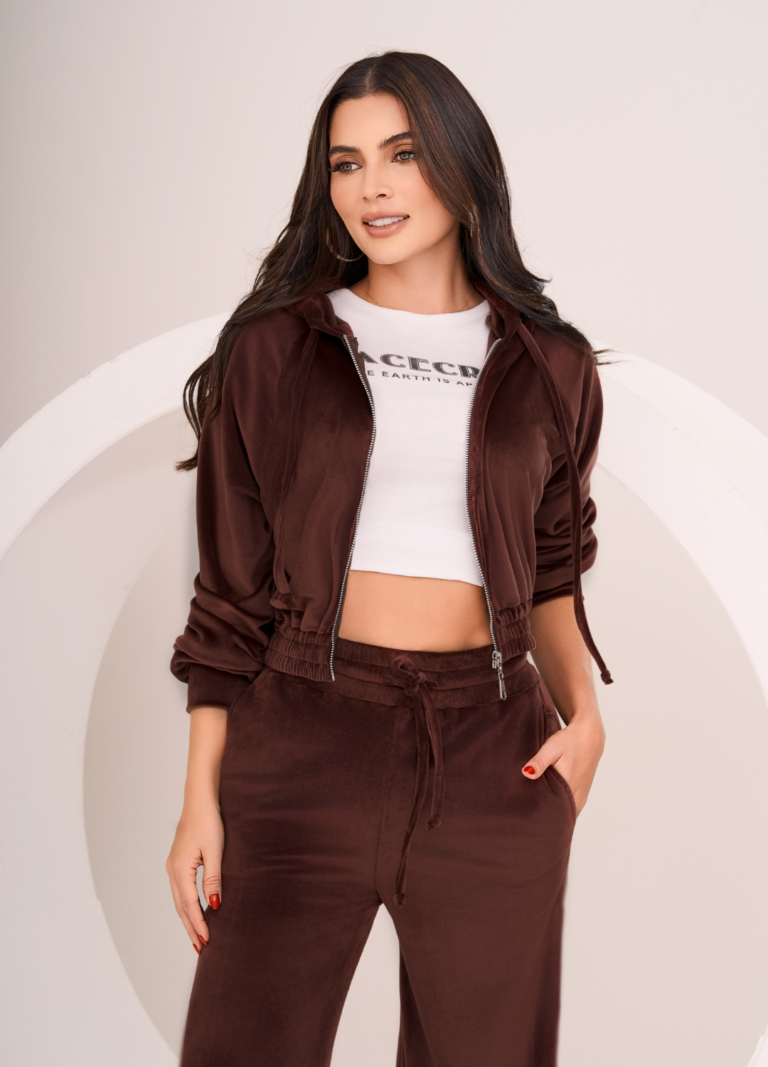 Luce sofisticada y radiante con este conjunto en tela velvet, de textura suave y acabado brillante.